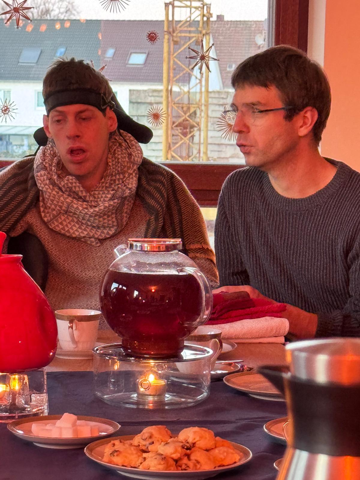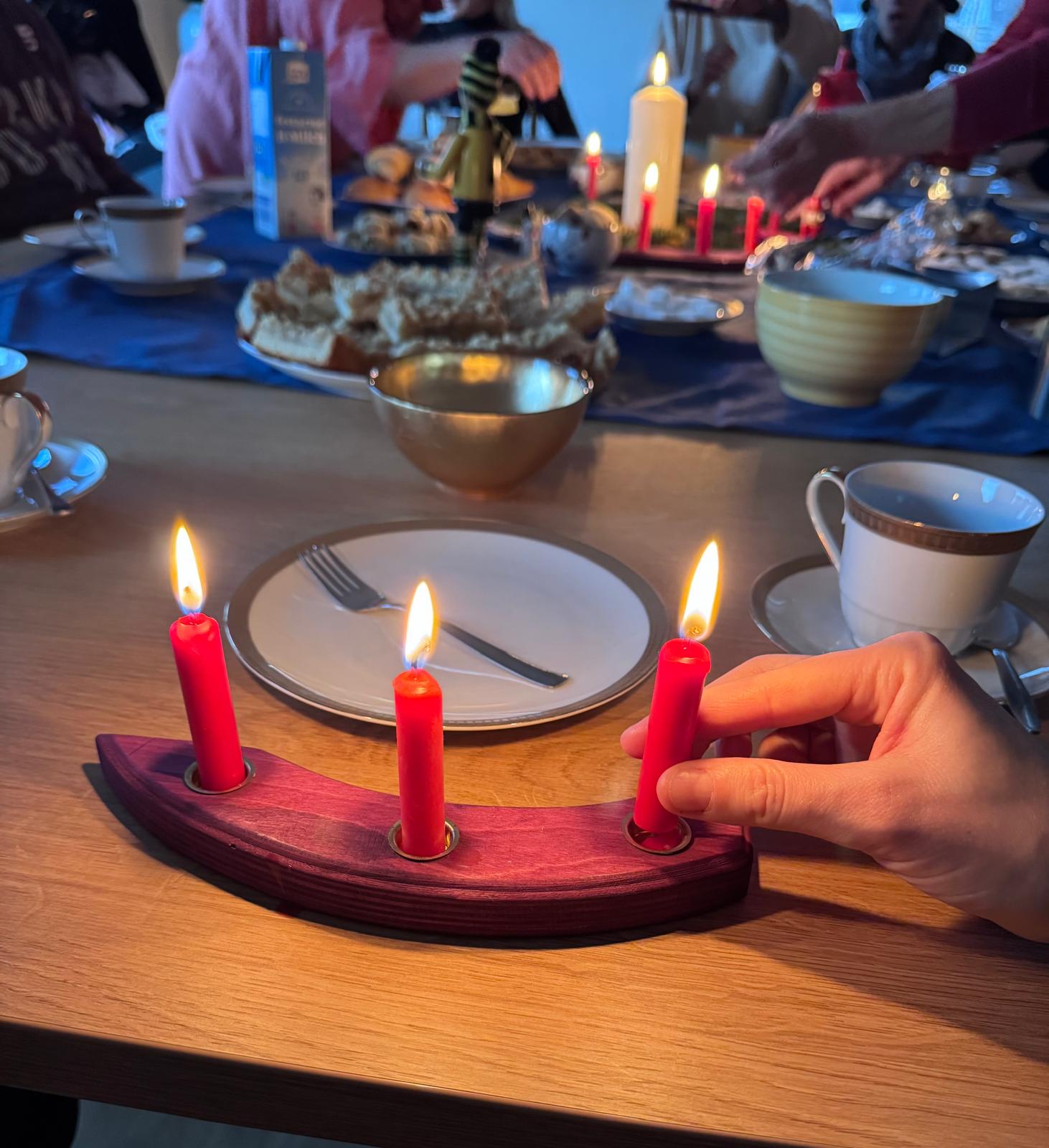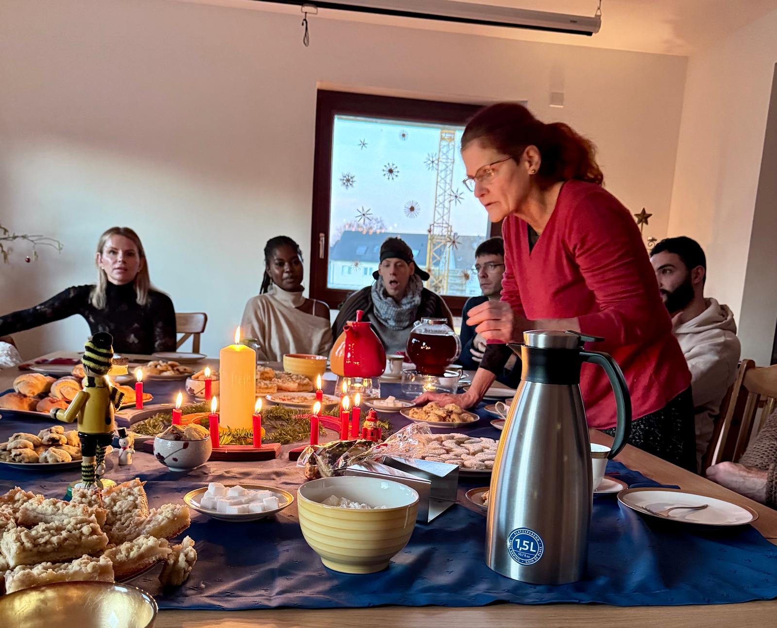 Jede*r brachte etwas Besinnliches in die Runde: der sanfte Ton einer Klangschale, Gedichte, Geschichten und Lieder schufen einen Raum der Aufmerksamkeit und Nähe. Besonders berührend war es, auch andere Kulturkreise erleben zu dürfen – mit „Stille Nacht“ auf Polnisch und einem arabischen Weihnachtslied, das die Vielfalt unserer Gemeinschaft spürbar machte. 🎶🌍